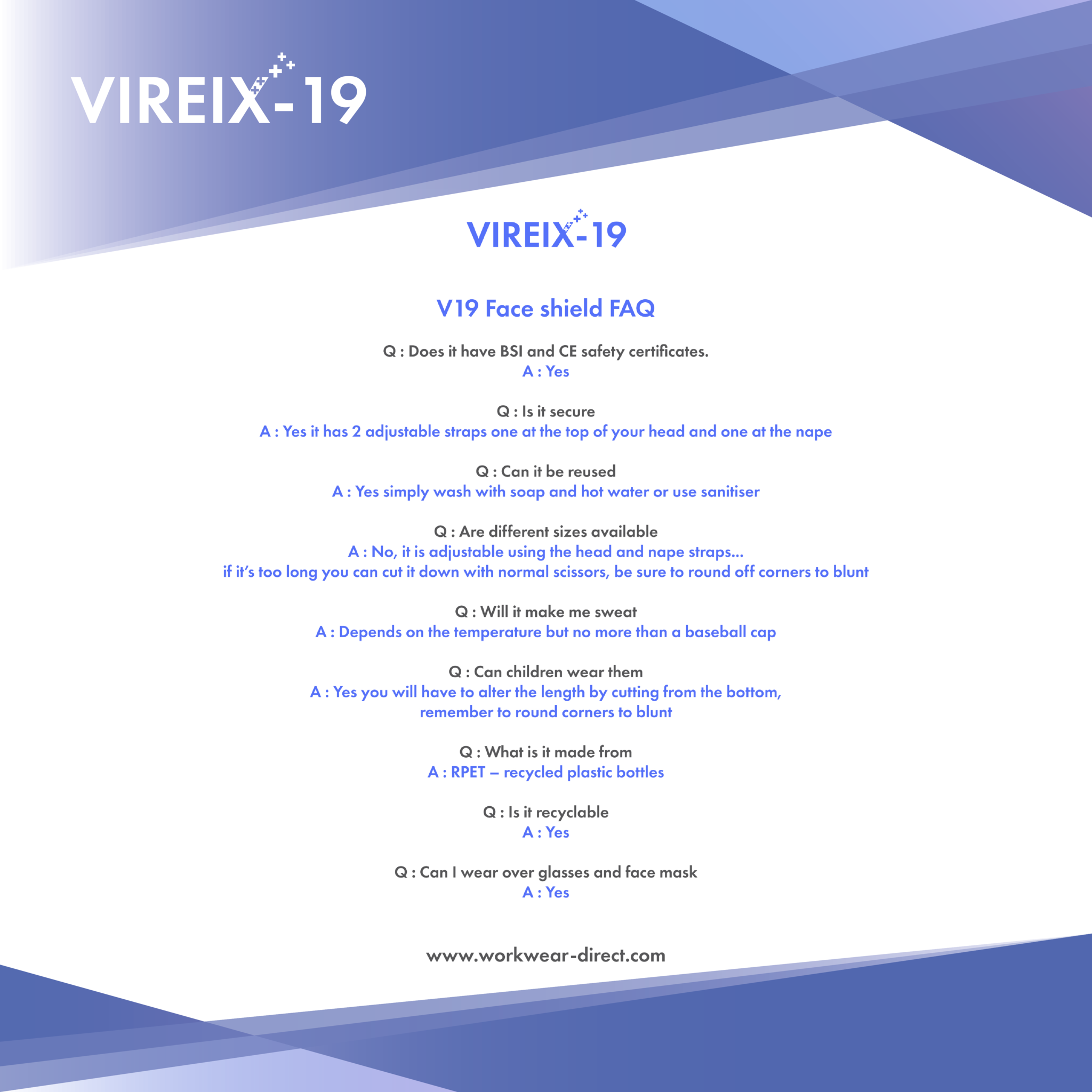 In addition to that, as the V19 Face Shield is made from one piece of thermoformed, impregnable PET, you can easily sanitise it from any harmful bacteria making it re-usable.